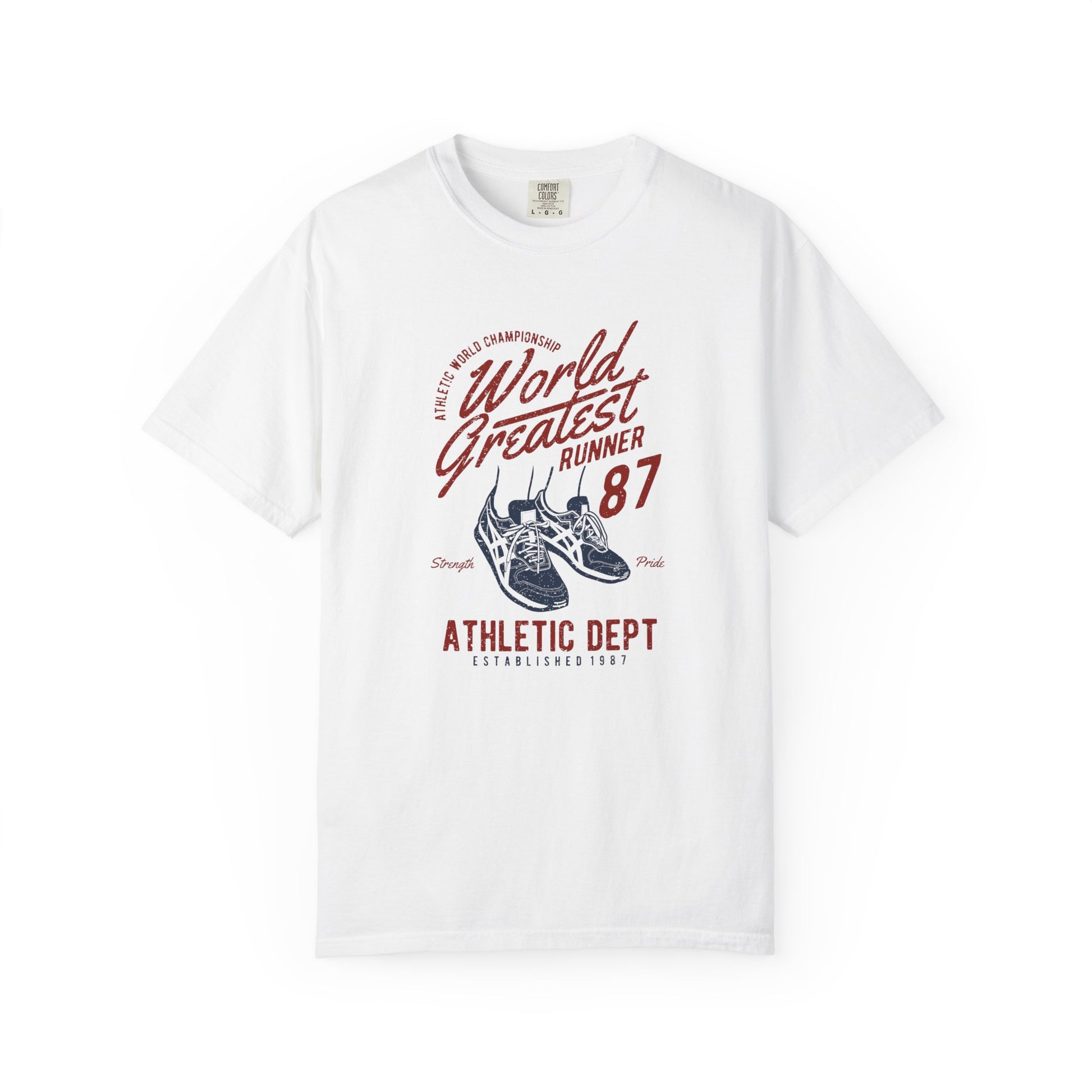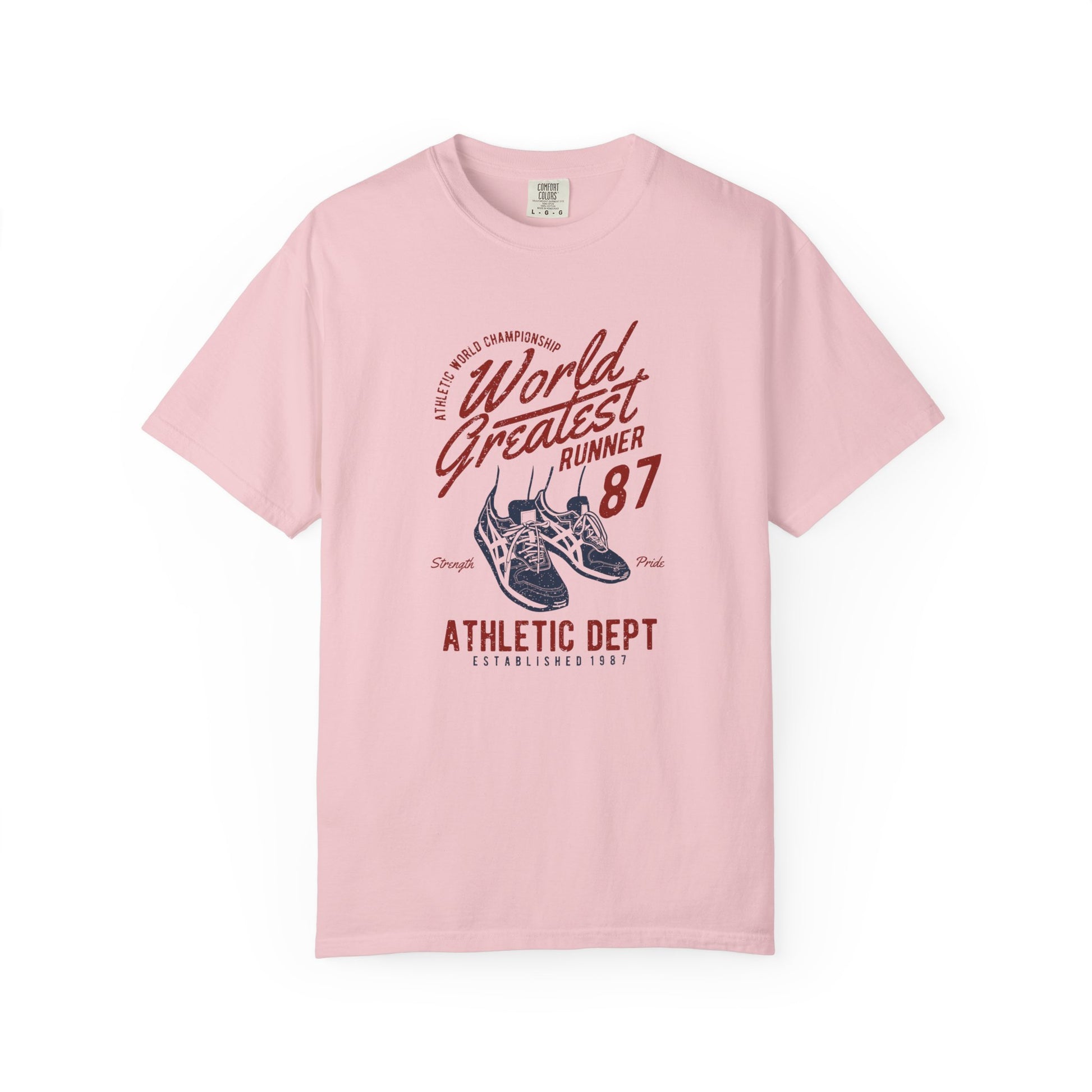 Channel champion energy in our World's Greatest Runner t-shirt. This retro-inspired graphic t-shirt features classic athletic department styling with vintage running shoe illustration and distressed typography that captures the spirit of 1980s track and field culture and oldschool athletic wear.
